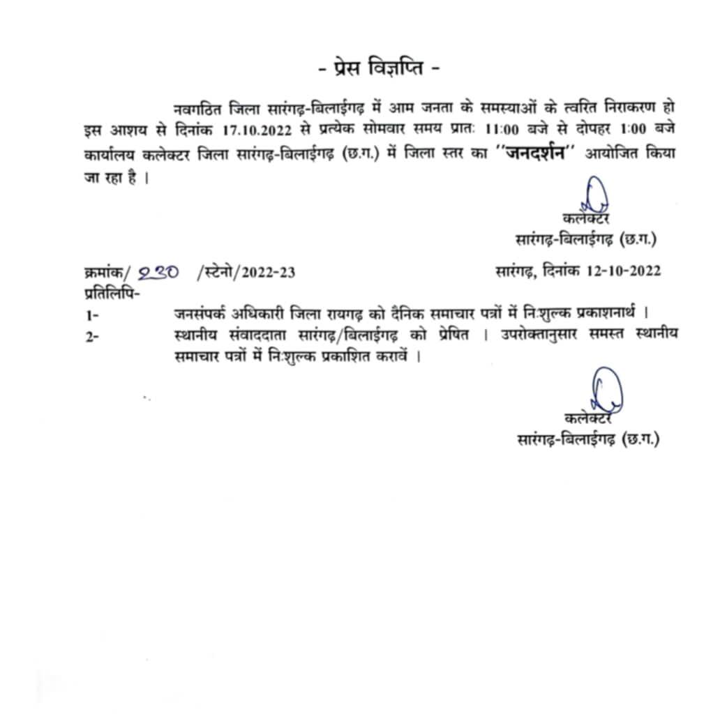 सारंगढ़। नवगठित सारंगढ़-बिलाईगढ़ ज़िला में जनहित तथा आम नागरिकों को कलेक्टर कार्यालय के सीधा सम्पर्क हो सके इस आशय से ज़िला कार्यालय में दिनांक 17/10/2022 से प्रत्येक सोमवार को समय ११ बजे से १ बजे तक जनदर्शन आयोजित किया जाएगा।