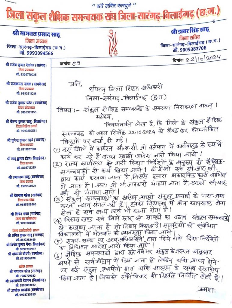 सारंगढ़ बिलाईगढ़ – जिला सारंगढ़ बिलाईगढ़ संकुल शैक्षिक समन्वयक संघ ने एल पी पटेल डीईओ सारंगढ़ बिलाईगढ़ को विभिन्न मांगों के संबंध में ज्ञापन सौंपा।राज्य परियोजना समग्र शिक्षा रायपुर के आदेश के अतिरिक्त कार्य संकुल समन्वयकों से कराया जा रहा है। जिसका विरोध समन्वयकों के द्वारा किया गया। कार्यवाहक के रुप से कार्यरत समन्वयकों का स्थायी आदेश कई बार ज्ञापन देने के बाद भी आज पर्यन्त तक जारी न होने पर भारी नाराजगी जताई गई एवं अन्य मांगों व समस्याओं से अवगत कराया गया।इस अवसर पर जिला अध्यक्ष भागवत प्रसाद साहू, जिला उपाध्यक्ष राजेश देवांगन, जिला सचिव डाबर सिंह साहू, जिला प्रवक्ता शंभू टंडन, जिला मिडिया प्रभारी चैतन्यकुमार साहू, विपिन भगत कोषाध्यक्ष,भगत राम पटेल ब्लॉक अध्यक्ष सारंगढ़, आलोक डनसेना ब्लॉक