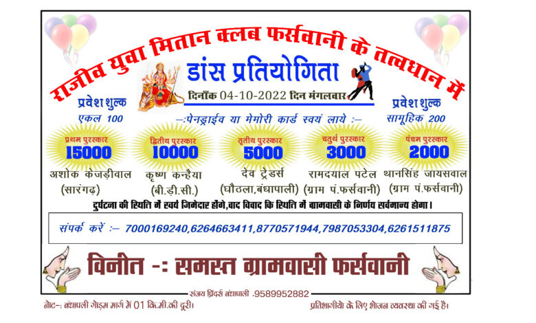 ग्राम पंचायत फर्सवानी (सारंगढ़) मे 4 अक्टूबर मंगलवार को होगा रात्रिकालीन ओपन चैलेंज डांस प्रतियोगिता…कलाकारों पर इनामों की होगी बौछार, अगर आप भी हैँ कलाकार, तो हो जाइए तैयार…