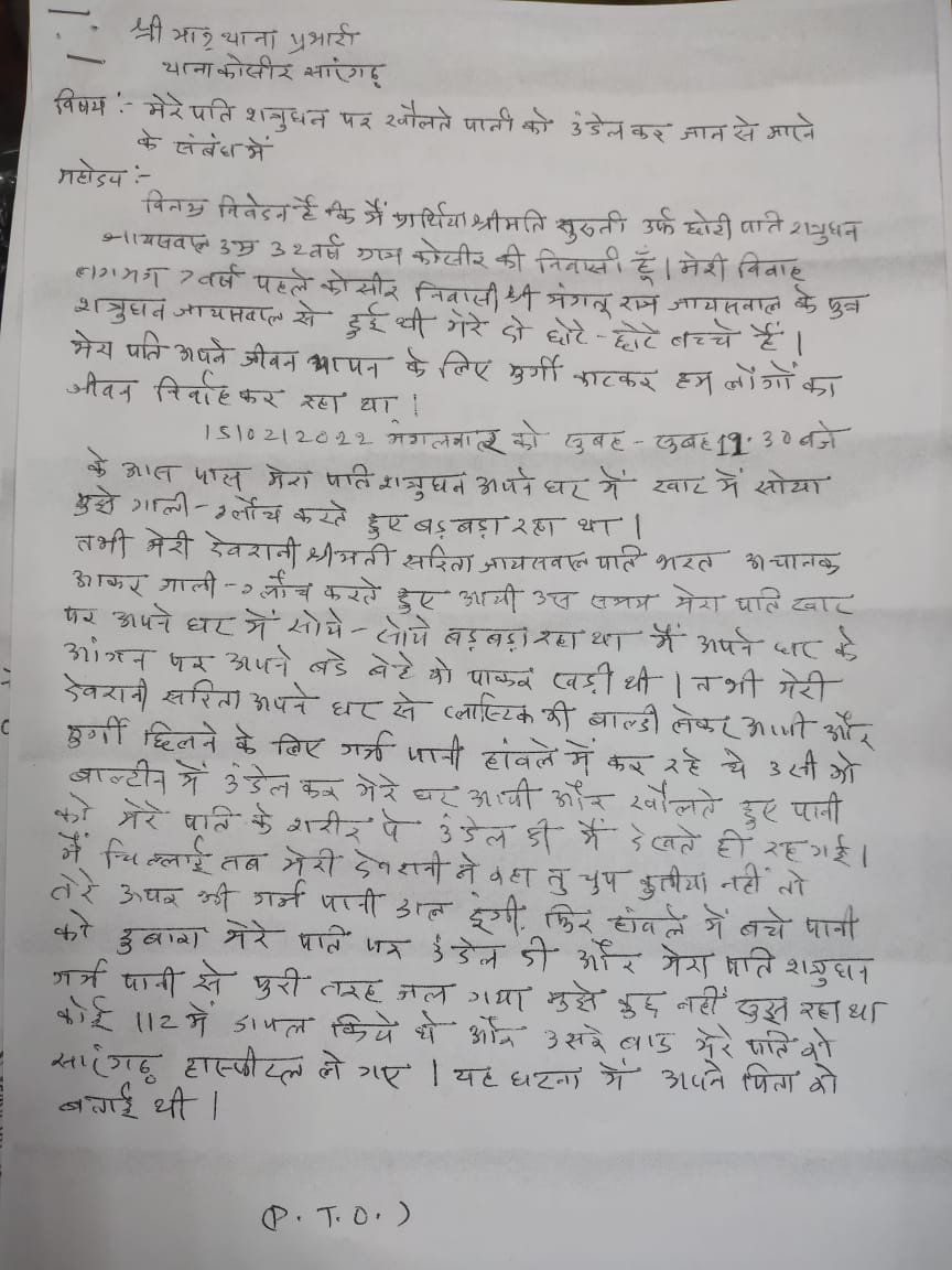 लिखित आवेदन के अनुसार सुरती जायसवाल ने बताया कि उसकी देवरानी स्वभाव से झगड़ालू और गुस्सैल प्रकृति की महिला है। शत्रुघ्न जायसवाल मुर्गी का धंधा कर अपने परिवार का भरण पोषण करता था। 15 फरवरी को दोपहर 11.30 बजे मृतक अपने घर मे सोया था तभी देवरानी से किसी बात पर बहस होने पर उसकी देवरानी सरिता जायसवाल पति- भरत जायसवाल मुर्गी के लिए कर रहे गर्म पानी को अपने जेठ शत्रुघ्न जायसवाल के ऊपर उड़ेल दी, जिससे शत्रुघ्न पूरी तरह झुलस गया। किसी तरह 112 बुलाकर उसे सारंगढ अस्पताल ले जाया गया, मामले की गम्भीरता को देखते हुवे रायपुर रेफर कर दिया गया, जहां 19 फरवरी को शत्रुघ्न की मृत्यु हो गयी।