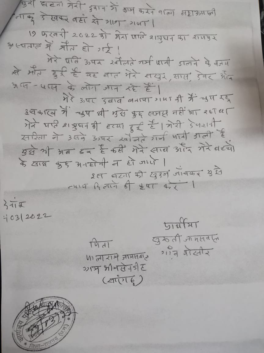 सारंगढ़। सारंगढ़ के कोसीर थाना अंतर्गत एक दर्दनाक और शर्मनाक मामला सामने आया है, जहां मृतक शत्रुघ्न जायसवाल की पत्नि ने थाने में अपने देवरानी के विरुद्ध अपने पति को मारने का गम्भीर आरोप लगाया है। लिखित आरोप में उसने अपने देवर, सास और ससुर पर भी मामले को दबाने और धमकाने की बात भी थाने में बताई है।