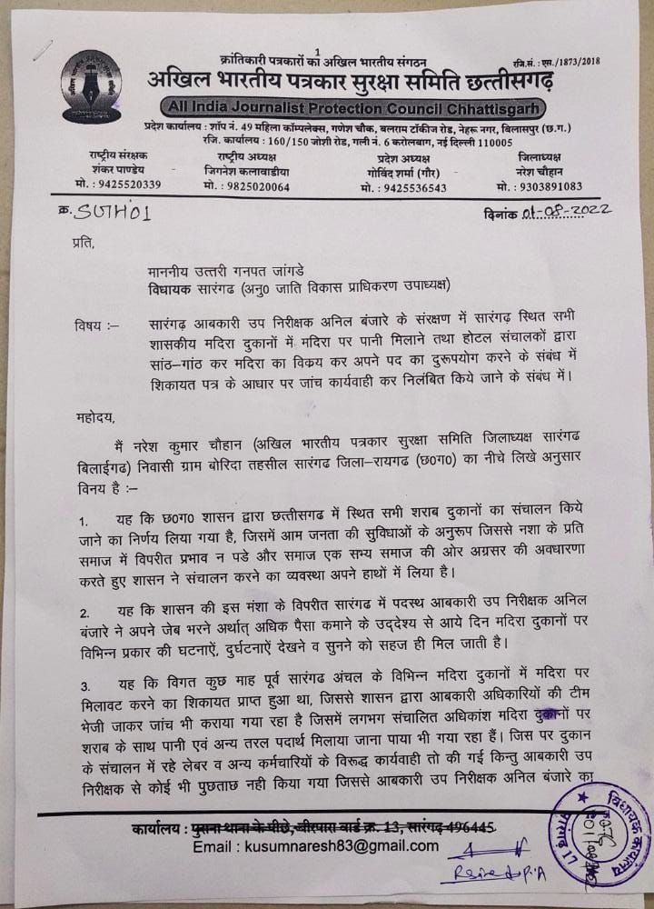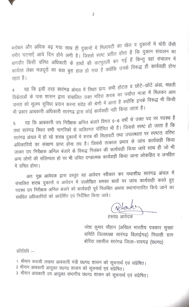 विदित हो आबकारी उप निरीक्षक अनिल बंजारे विगत 5-6 वर्षों से उक्त पद पर पदस्थ है तथा सारंगढ स्थित नेताओं और अवैध व्यापारियों के साथ दुकानदार और नागरिकों से व्यक्तिगत परिचित भी है। जिसका फायदा उठाकर सेटिंगबाजी मे श्री बंजारे माहीर हो चुके हैँ, और कभी खुदपर कार्रवाई ना होता देख इनका मनोबल बढ़ना लाज़मी है। अतः अखिल भारतीय पत्रकार सुरक्षा समिति ने विधायक उत्तरी जांगड़े से यथाशीघ्र सारंगढ अंचल में संचालित शराब दुकानों व आवेदन में उल्लेखित समस्त बातों पर जांच कार्यवाही करते हुए पदस्थ उप निरीक्षक अनिल बंजारे को कार्यवाही पूर्व निलंबित अथवा स्थानांनतरित किये जाने का संबंधित अधिकारियों को आदेरशित एवं निर्देशित करने की मांग की है।